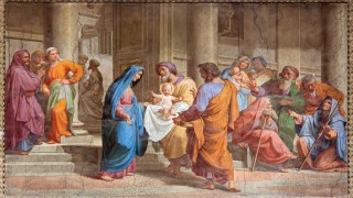 La Présentation de Jésus au Temple est relatée dans l’Évangile selon Luc (2, 30-38). Comme cité précédemment, Marie et Joseph respectent la loi de Moïse – bien que la loi juive n’exige que la purification des femmes quarante jours après avoir donné naissance (Lévitique 12) – et amènent Jésus au Temple, à Jérusalem. Les parents des garçons premiers-nés devaient, dans la tradition juive, présenter leur fils à Dieu comme offrande et racheter celui-ci, en mémoire du passage de l’Ancien Testament, lorsque Dieu a épargné les premiers-nés du peuple hébreu au moment des dix plaies d’Égypte.